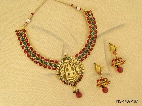 Kemp Stone Jewellery , Laxmi Ji Triple Kemp Stone Layer Temple Necklace Set | Manek Ratna