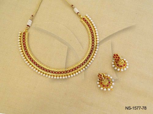 Kemp Stone Jewellery , Round Stone Single Layered Moti Drop Kemp Necklace Set | Manek Ratna