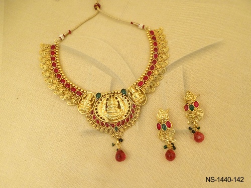 Kemp Stone Jewellery , Tridevi Laxmiji Oval Base Kemp Temple Necklace Set | Manek Ratna